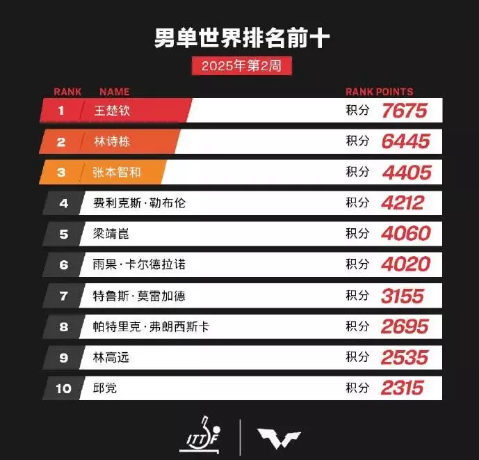 男子单打,中国队球员王楚钦、林诗栋位列前二,梁靖崑位列第五,林高远位列第九。